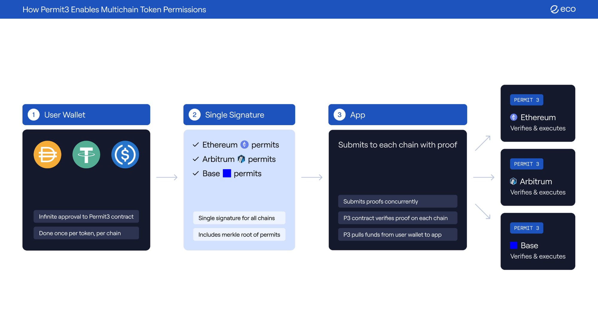 Today, Eco is releasing Permit3, a token approval contract that enables truly unified multichain experiences. We initially developed Permit3 as a solution to enable global stablecoin balances, multi-input intent orders, and greater gas efficiency across any EVM chain. But we also believe the broader ecosystem would benefit from a standardized approach to multi-chain token permissions, so we've extended Permit3 into a general solution and an open protocol that any developer can integrate.